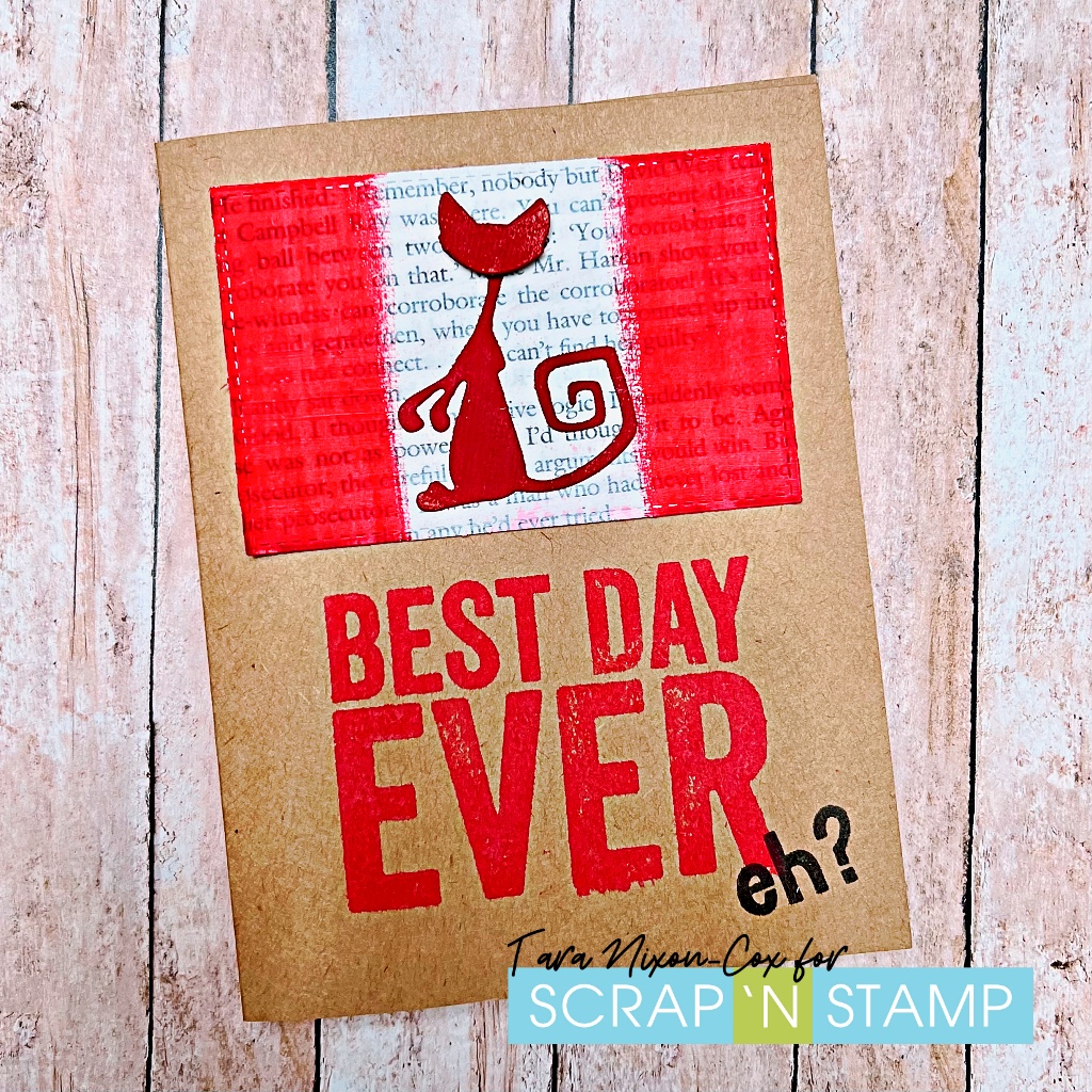 For the second card, I went for a perfect match and cut the cat from white card stock which I painted red first. It definitely gives a more intense color! Both cards are finished off with Bold Sayings by Tim Holtz stamped in matching Distress Oxide ink and an 'eh' from an O Canada! stamp set in black.